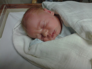 | Aunt Becky bought him this little outfit and dressed him all up in it. . .then she wrapped him in this really neat summer blanket that is light-weight but lets the baby snuggle. |